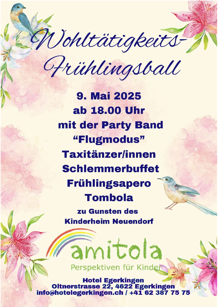 Das Hotel Egerkingen veranstaltet zugunsten der Kinder der amitola einen Frühlingsball. Lassen Sie sich diese Gelegenheit nicht entgehen und schwingen Sie das Tanzbein für einen guten Zweck.